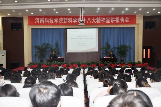 为深入学习贯彻党的十八大精神,把全院广大党员干部和师生员工的思想统一到党的十八大精神上来,把力量凝聚到实现党的十八大确定的各项任务上来,根据新科学院党委统一安排,12月6日,河南科技学院校长助理、新科学院院长梅宪宾教授在新行政楼三楼报告厅为我院师生作题为《加强党的建设推动中原经济区又好又快发展》的专题报告,为我院十八大精神宣讲工作拉开序幕。报告会由我院党委副书记冀红举主持。我院全体教职工、学生干部代表300余人参加报告会。