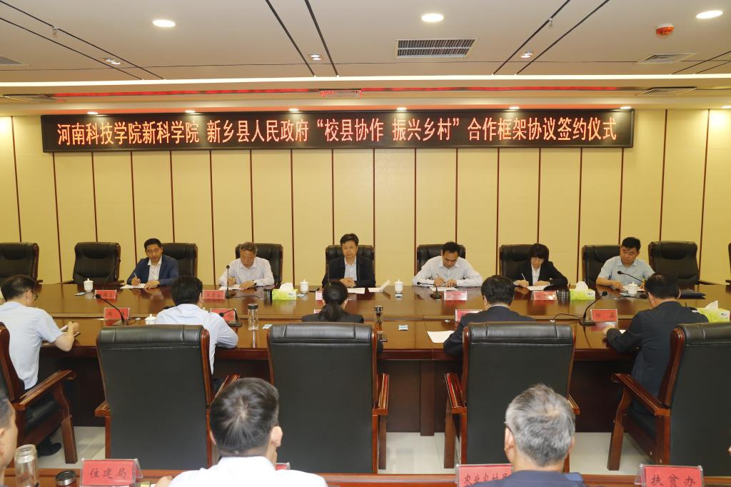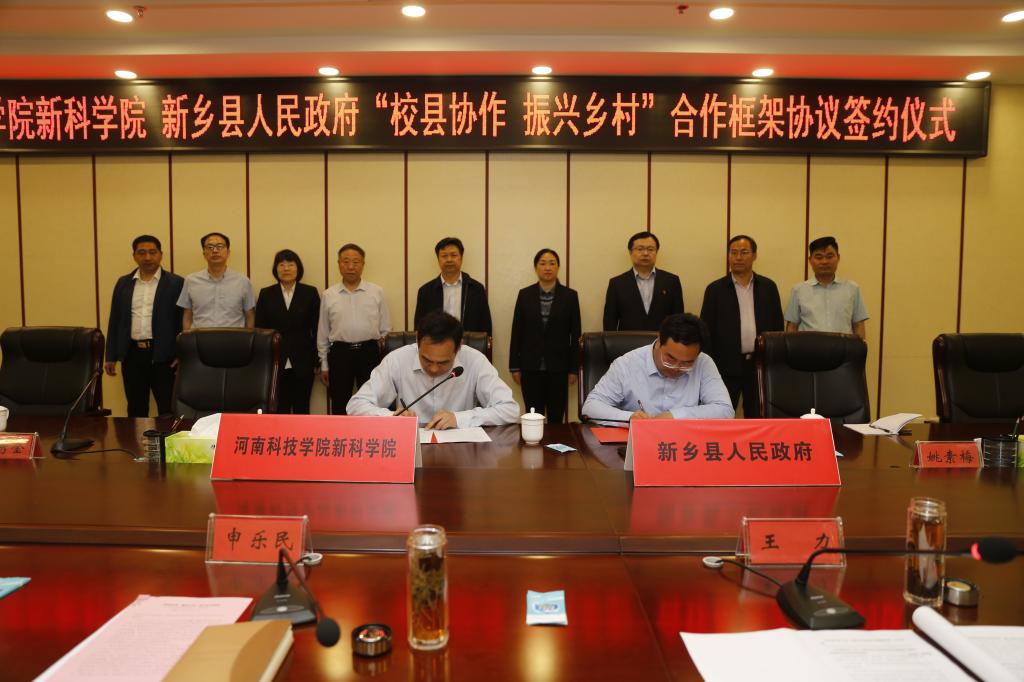 5月14日上午,我院与新乡县人民政府“校县协作 振兴乡村”合作框架协议签约仪式在新乡县商务中心举行。院长刘鸣韬、党委书记张忠迪、副书记王秀金、副院长姚素梅及党政办、组宣部负责同志,新乡县委书记申乐民,新乡县委副书记、县人民政府县长祝显成,新乡县委副书记王力,新乡县委宣传部部长周伟,副县长祁磊及各相关单位负责同志、各乡镇乡镇长等出席签约仪式。签约仪式由新乡县委副书记王力主持。