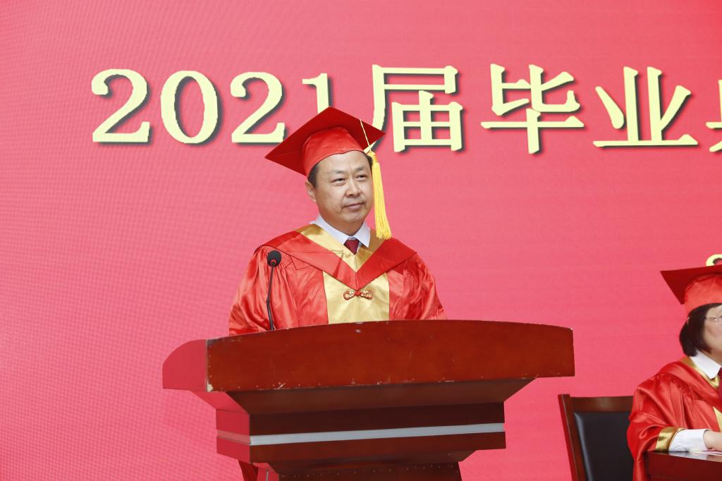 他指出,2021届毕业生在考研、专业竞赛、“三支一扶”、“西部计划”和应征入伍等方面取得的骄人成绩,正是“素位而行 至诚无息”校风的最好诠释。我们之所以将“素位而行 至诚无息”作为校风,既是学院办学过程中的历史积淀,更是对广大师生的提醒和勉励。他表示,校园生活是以“学习和记忆”为主题的,而社会生活则是以“实践和感悟”为主旋律,毕业生走向社会,面对全新的环境,“素位而行”,就是要大家敢于正视现实,笑迎挑战,直面困难,越挫越勇。顺境时铆足干劲、拼搏奋斗,逆境中笃定气韵、抱朴守正。他寄语毕业生要以“知行日新”的进取精神,“至善至真”的目标追求,“素位而行”的做事态度,“至诚无息”的不懈努力,走好人生路,挺进新高度,真正做到让家长放心、使社会认可、对国家有用。
