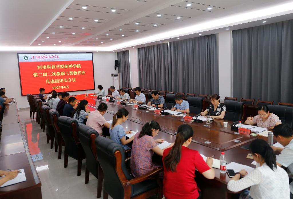 6月10日,我院第二届二次教职工暨教代会代表团团长会议在综合实验楼第一会议室举行。全体院领导出席会议,新科学院分工会主席团成员、教代会代表团团长、新科学院分会第二届委员会委员参加会议。会议由院工会主席张慧辉主持。