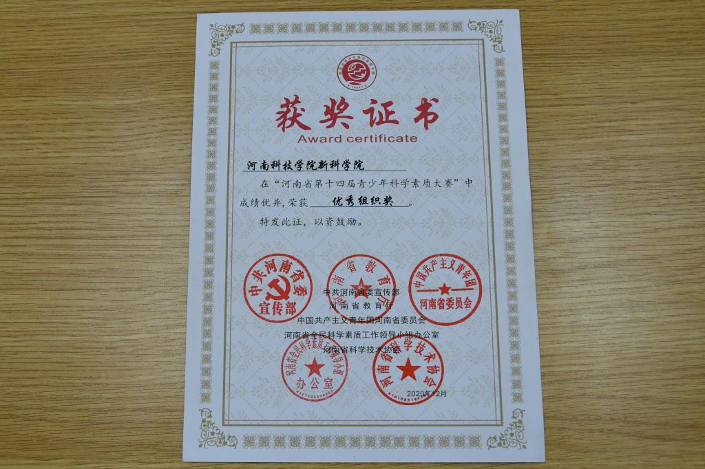 近日,河南省委宣传部、省教育厅、共青团河南省委、省素质办、省科协等单位联合发布《关于公布河南省第十四届青少年科学素质大赛获奖名单的通知》。我院高度重视,积极组织学生参与,通过师生努力,荣获河南省“优秀组织奖”;郑俊珂等七位老师荣获新乡市“优秀辅导奖”,焦钰等八位同学荣获新乡市赛区“大学组一等奖”,游庆文等十一位同学荣获新乡市赛区“大学组二等奖”,刘晓霞等十九位同学荣获新乡市赛区“大学组三等奖”。