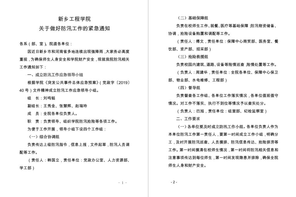 7月17日8时至22日6时,新乡市出现特大暴雨,小时雨强和累计降雨量均超过新乡市有观测记录以来的历史极值。汛情发生后,新乡市市委、市政府启动Ⅰ级应急响应,开展防汛救灾。面对突如其来的险情,我院广大党员干部迅速行动,全力以赴投身防汛抢险战斗中去。