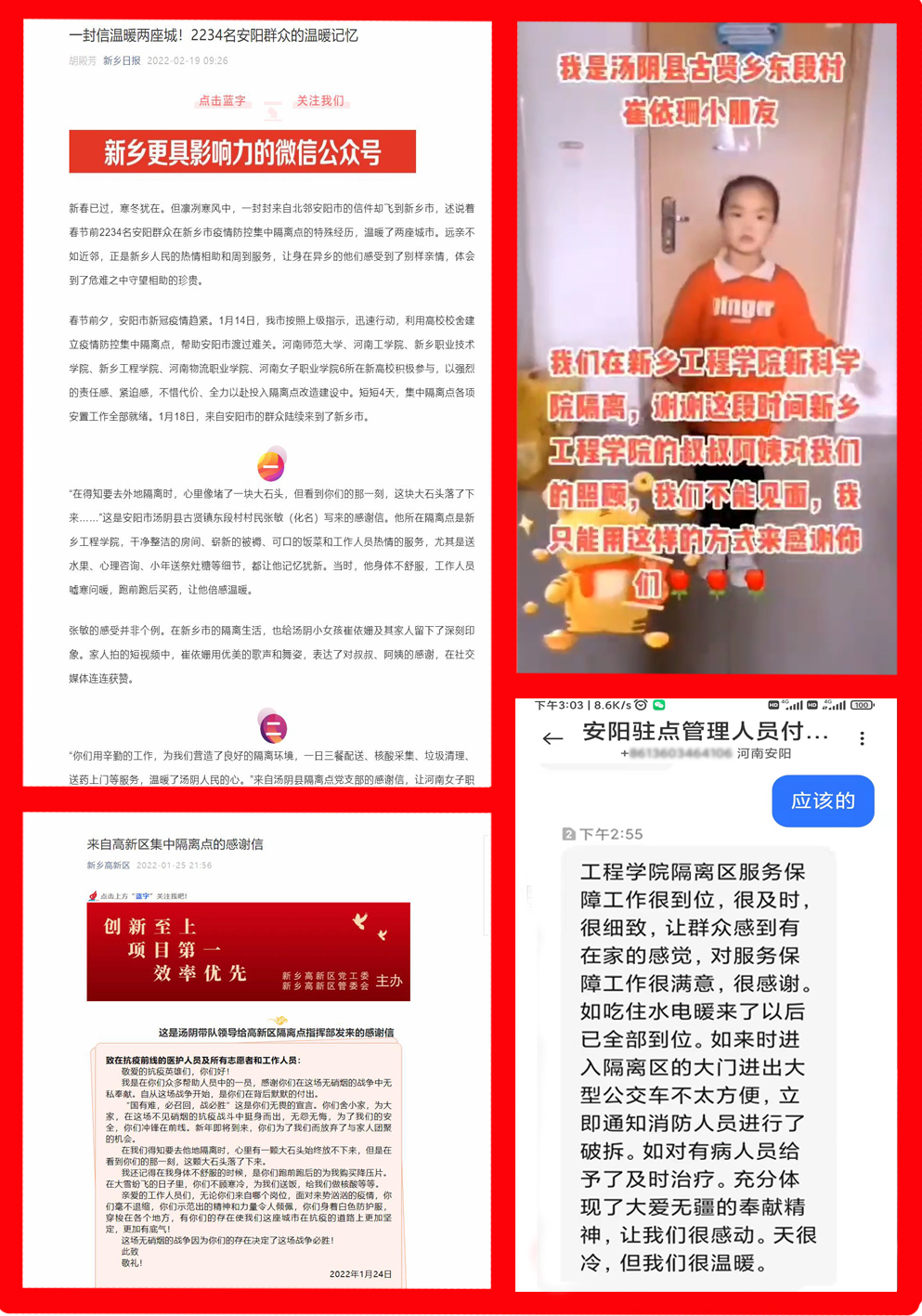 在隔离点使用期间,学校整理的洁净宿舍、属地政府提供的丰富物资、管理团队的专业服务等温暖了隔离群众的心,增强了他们战胜疫情的信心和决心。隔离群众以不同方式对我校、属地单位得力的举措和温暖的服务致以敬意和谢意。