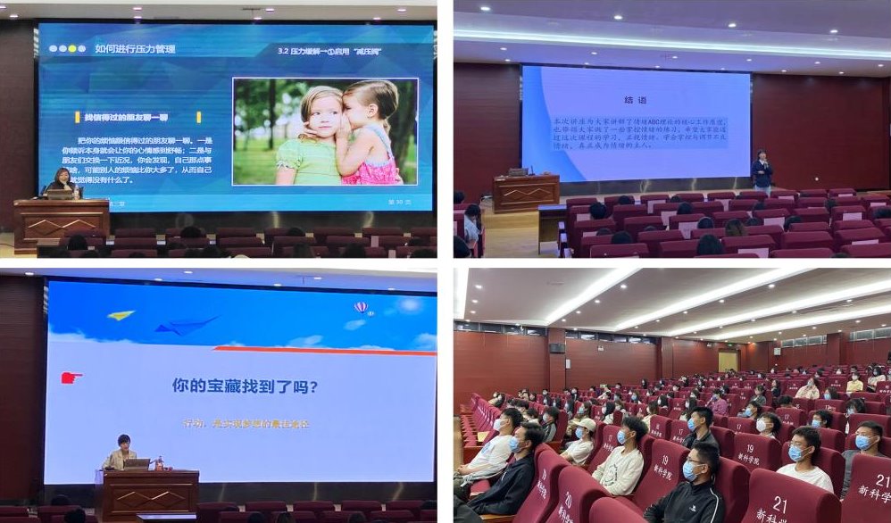 讲座中,随洁英以“情绪管理,助人助己”为主题,以学会利用ABC理论缓解消极情绪为着眼点,结合具体案例启发同学们寻找不合理信念,向同学们传授心理疏导的基本方法和技巧。焦红艳以“轻松减压,微笑生活”为主题,从贴近学生生活视角,用幽默诙谐的语言从“为什么需要压力管理”、“如何进行压力管理”和“组织压力管理具体策略”三个方面分享了压力来源以及压力管理方法。郭丽娟以“自我疗愈,寻宝之旅”为主题带领同学们开启了一场积极心理学视角下的寻宝之旅,并结合《牧羊少年的奇幻之旅》,采用问题启发式策略,引导同学们将思维轨道转换至积极心理学层面,寻找属于自己的心理宝藏。