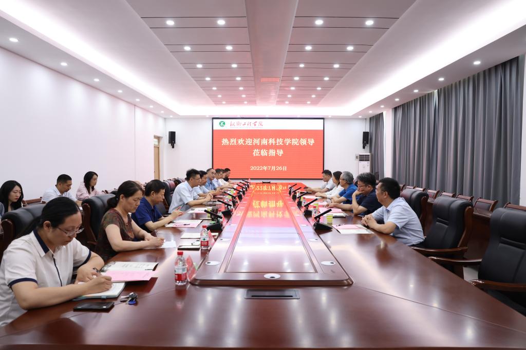 7月26日下午,河南科技学院党委书记宋亚伟、校长阚云超、副校长王霞一行5人莅临我校交流座谈,座谈会在综合实验楼201会议室举行。董事长赵建永、校党委书记陈广文及全体校领导等参加座谈会。座谈会由常务副校长张现周主持。