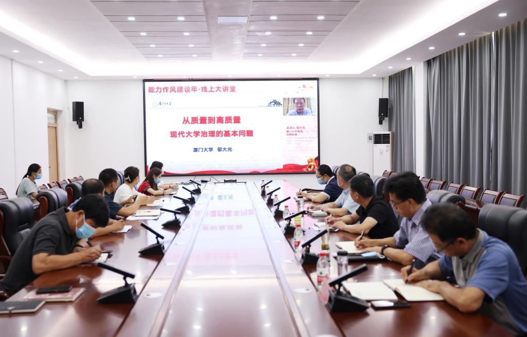 8月24日,我校组织收看了第五期“能力作风建设年·线上大讲堂”专题辅导报告会。厦门大学原副校长、厦门大学南强特聘教授、中国高等教育学会副会长、教育部高等学校专业设置与教学指导委员会副主任邬大光教授作了题为“从质量到高质量——现代大学治理的基本问题”专题辅导报告。省委教育工委专职委员何秀敏主持报告会,校领导、各党总支(直属党支部)负责人、校“能力作风建设年”活动工作组组长在综合实验楼201会议室集中收看了报告。