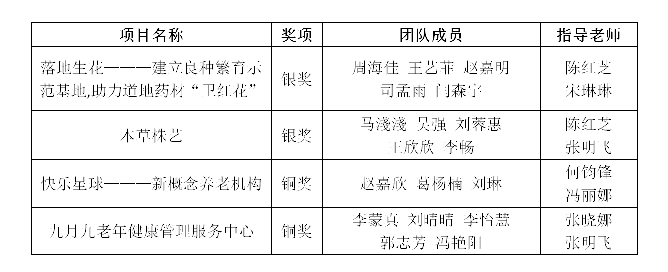 近日,2022年“挑战杯”河南省大学生创业计划竞赛获奖名单公布。在本次竞赛中,我校参赛项目取得银奖2项,铜奖2项的优异成绩。其中《落地生花—建立良种繁育示范基地,助力道地药材“卫红花”》《本草株艺》两项获得银奖,《快乐星球—新概念养老机构》《九月九老年健康管理服务中心》两项获得铜奖。