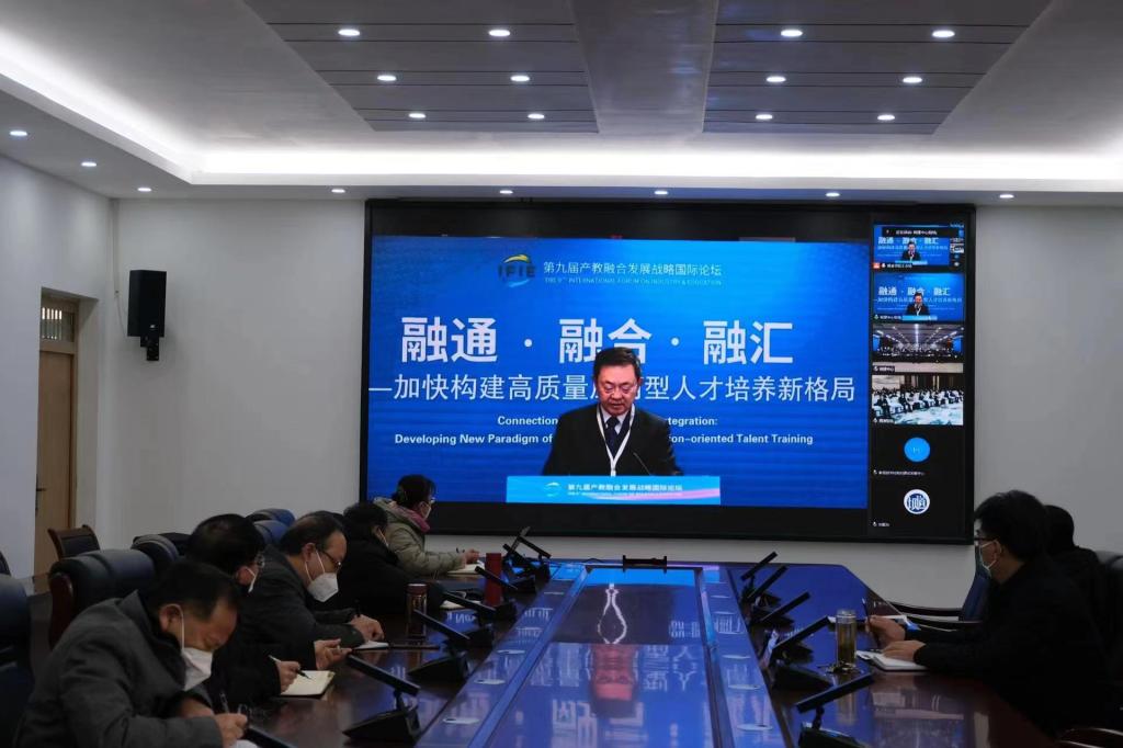 2023年1月10日上午,第九届产教融合发展战略国际论坛开幕,我校在综合实验楼201会议室组织观看,副校长赵一鹏、赵瑞玲,各学院院长、教务处副处长参加了开幕式。第九届产教融合发展战略国际论坛由教育部和河南省人民政府作为支持,教育部学校规划建设发展中心、中华职业教育社、中国职业技术教育学会、应用技术大学(学院)联盟主办,驻马店人民政府、黄淮学院承办。