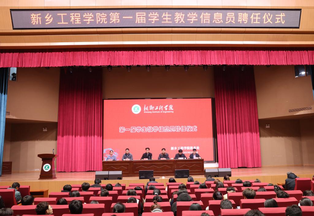 2月20日下午,我校在第一报告厅举行学生教学信息员聘任仪式。副校长赵一鹏、校长助理杜灵来、教务处、学工部、招生就业处及各学院相关负责人员、全体学生教学信息员共460余人参加。会议由教务处副处长王秀鸽主持。