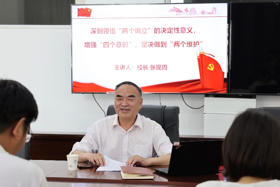 5月17日下午,校长张现周在综合实验楼208会议室以“深刻领悟‘两个确立’的决定性意义,增强‘四个意识’,坚决做到‘两个维护’”为主题,讲授了一堂生动的主题教育专题党课。机关教工第一党支部全体教工党员聆听了党课。