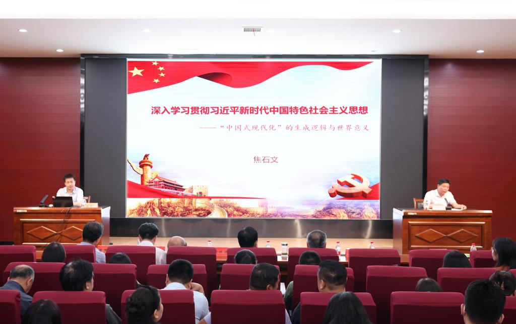 焦石文教授围绕深入学习贯彻习近平新时代中国特色社会主义思想和党的二十大精神,从“中国式现代化是如何实现的”“中国之治与西方之乱”“中国式现代化的世界意义”三个方面着手,全面解读、深刻阐释了“‘中国式现代化’的生成逻辑和现实意义”这一报告主题。焦石文旁征博引世界多国政要、学者的观点,通过辩证的思维、丰富的材料、详实的数据,形象生动、深入浅出地诠释了中国式现代化蕴含的价值观、文明观、民主观等及其伟大实践。焦石文指出,中国式现代化是在中国共产党领导下的伟大实践,是一条超越西方国家现代化既定模式的新道路,既有各国现代化的共同特征,更有基于自己国情的中国特色,具有强大、持久的生命力,给发展中国家走向现代化提供了新的路径,为人类文明探索出了一种新的形态,为马克思主义在当今世界展现其现实性提供了空间。