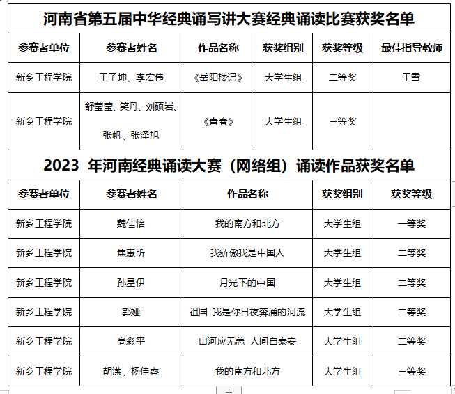此外,我校在2023 年河南经典诵读大赛(网络组)诵读作品评比活动中,荣获大学生组一等奖1项,二等奖4项,三等奖1项,成绩优异。