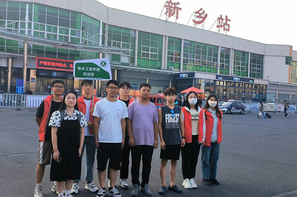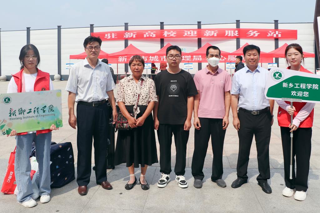 校领导到高铁站看望慰问志愿者、与新生家长交谈合影