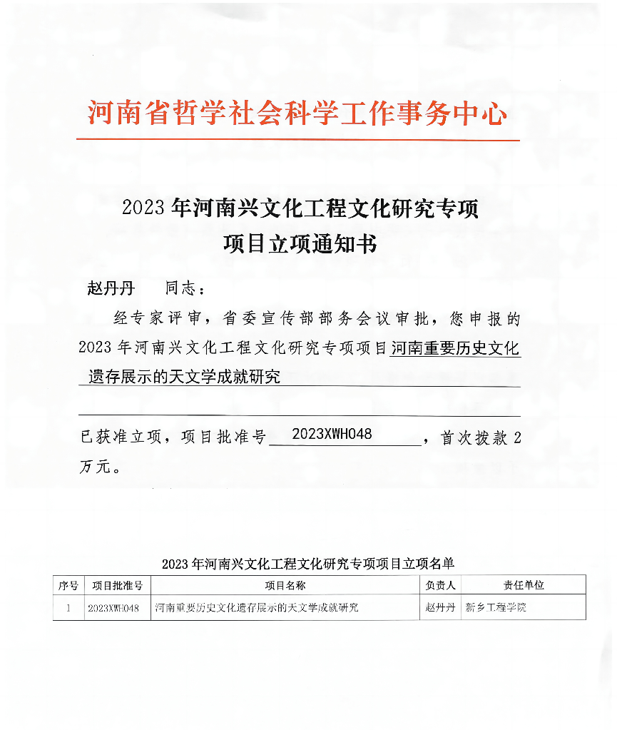 近日,经专家评审、省委宣传部部务会议审批,河南省哲学社会科学工作事务中心公布了2023年河南兴文化工程文化研究专项项目立项通知,我校赵丹丹老师主持申报的《河南重要历史文化遗存展示的天文学成就研究》获批立项,这是我校近年来承担的首个河南省省级科研项目,实现了我校在哲学社会科学领域省级课题立项的重要突破。