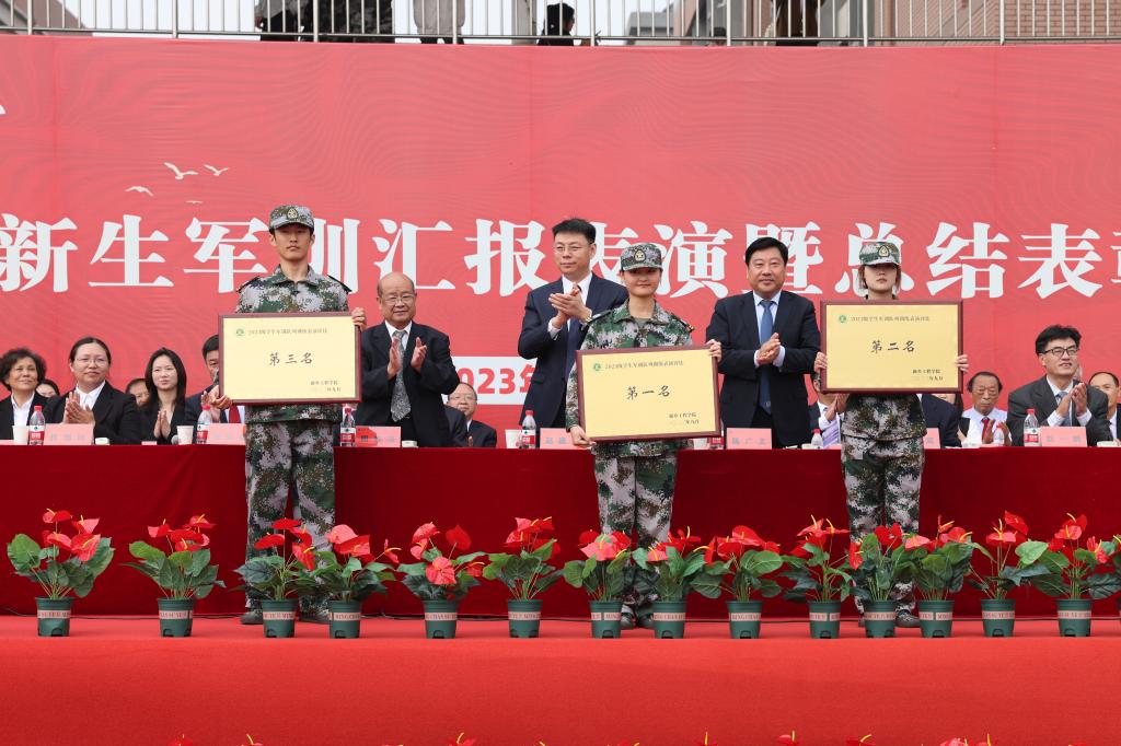赵一鹏宣读了军训工作获奖单位和个人名单。随后,校领导分别为军训先进集体、优秀标兵、优秀教官、优秀指导员颁奖。