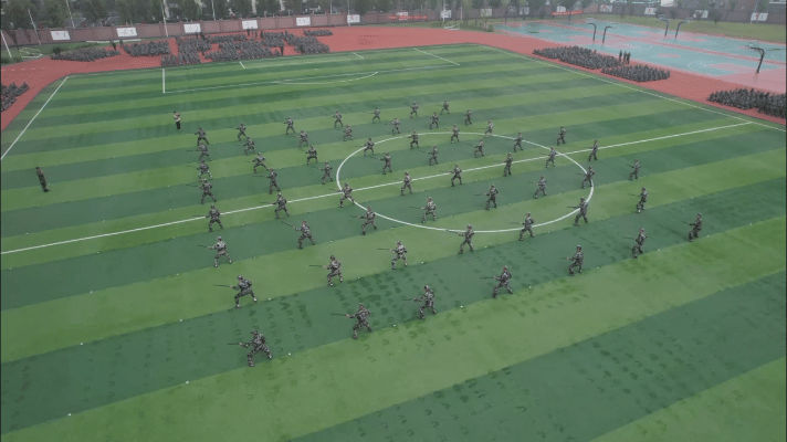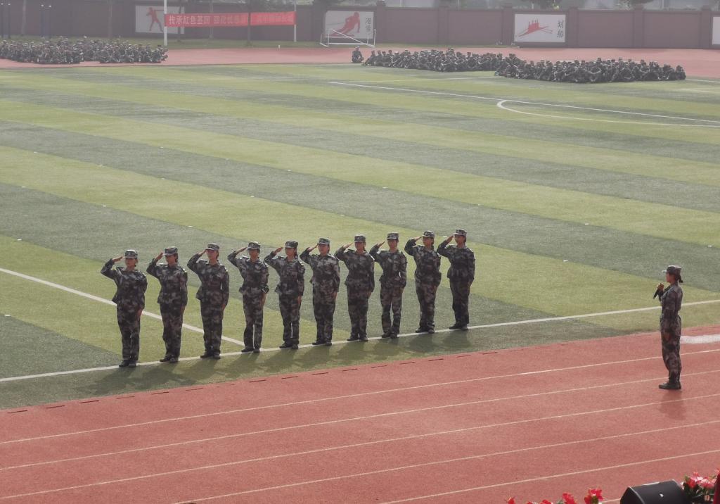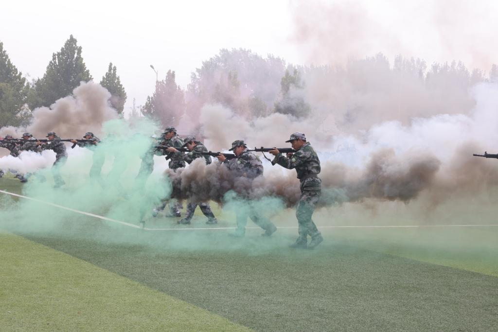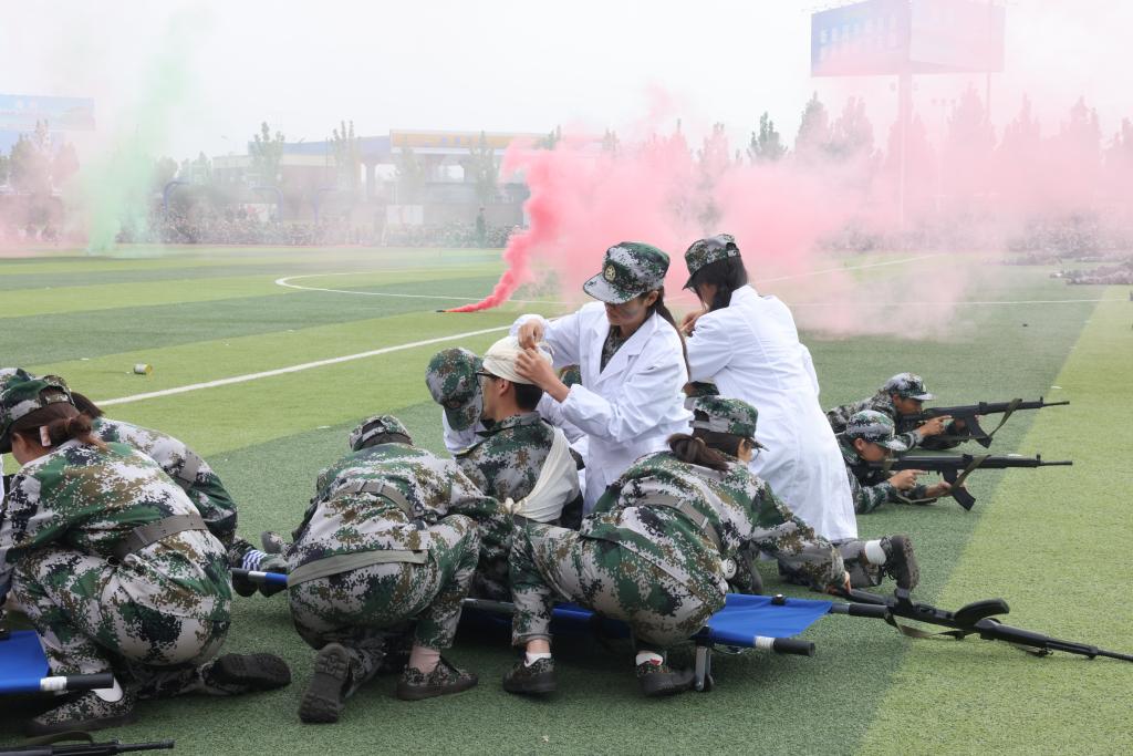 在军训成果汇报特色表演中,英姿飒爽的新生们给大家带来了一场超燃的视觉盛宴:刺杀操一突一刺、一防一击,杀声震天、豪情满怀,尽显军旅男儿时代风采;应急棍术的每个动作自成一体又互相融合,充分展示了队伍的高度配合;匕首操方队精神焕发、敏捷有力,尽显巾帼飒爽英姿;战场救护方阵在硝烟弥漫的模拟战场上冷静处理、包扎伤员,以最快的速度和过硬救护的技能为伤员的生命保驾护航;十位女生标兵,她们迈着齐刷刷的步子,军训的每一个正步都藏着她们对未来的坚定。