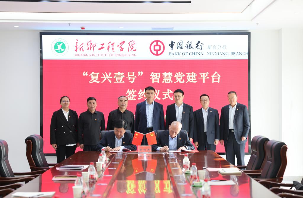 为全面贯彻落实习近平新时代中国特色社会主义思想和党的二十大精神,10月16日,我校与中国银行新乡分行在图书馆1113会议室举行“复兴壹号”智慧党建平台签约仪式。中国银行新乡分行行长刘晓阳、纪委书记于国庆、党委组织部副部长王勇、国贸支行行长李晋欣,我校董事长赵建永、党委书记陈广文、校长张现周、党委副书记张永福、副校长赵瑞玲、党委组织统战部、财务处负责人等出席了此次签约仪式。