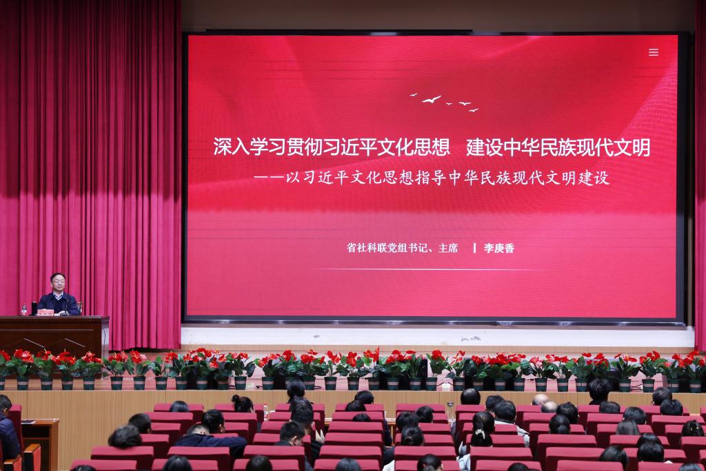 李庚香以《深入学习贯彻习近平文化思想 建设中华民族现代文明》为题,详细解读了习近平文化思想的理论体系、丰富内涵和重要意义,生动阐释了在唯物史观和大历史观的宏观视角下如何看待中华优秀传统文化、中华民族现代文明和人类文明新形态,分析总结了河南省立足于中原文化、黄河文化实施新文旅战略面临的机遇挑战、作出的探索实践,最后分享交流了“构建中国自主知识体系的河南探索”的思考与见解。近2个小时的报告,李主席旁征博引、博古通今,引史据印、娓娓道来,用深厚的理论功底和丰富的知识储备给大家奉献了一场思想文化交融碰撞的精彩盛宴。