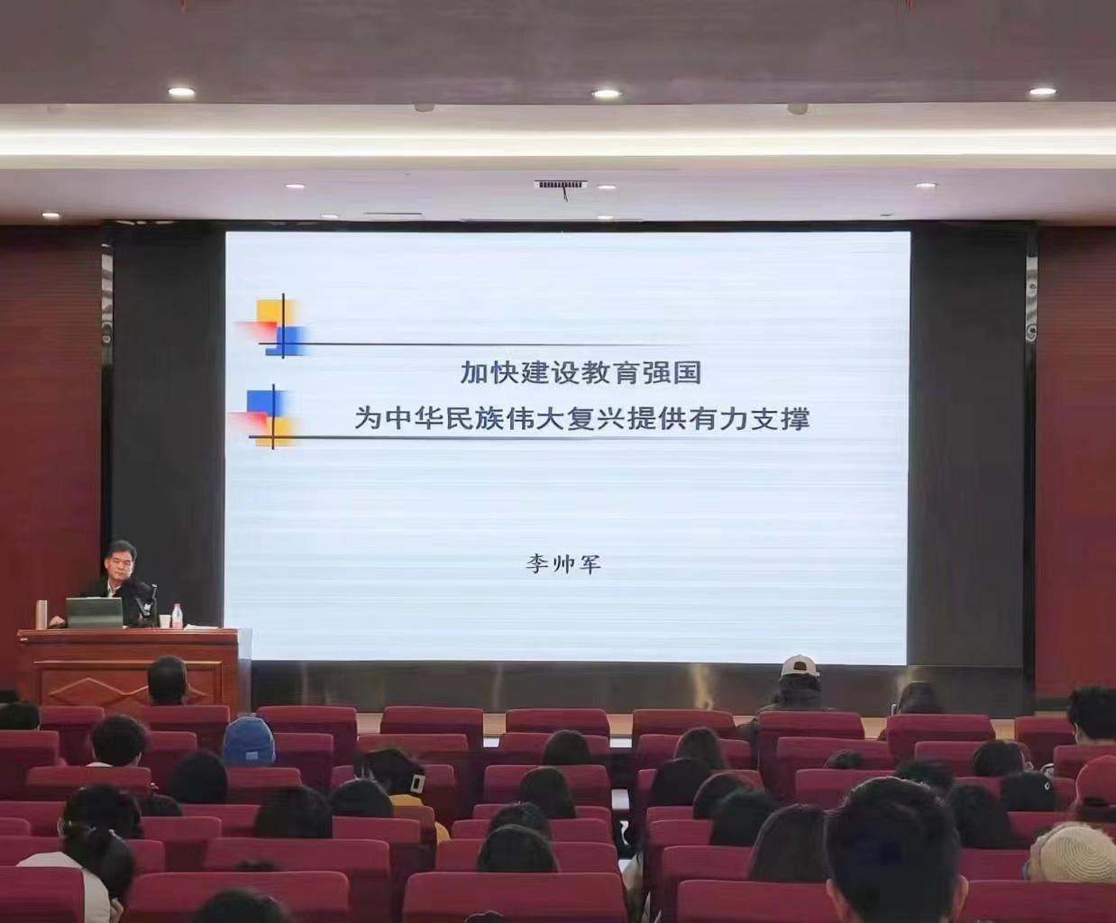 李帅军以“加快建设教育强国,为中华民族伟大复兴提供有力支撑”为题,从新时代建设教育强国的内涵、加快建设教育强国是新时代中国教育的神圣使命、新时代加快建设教育强国的历史成就和现实挑战、新时代加快建设教育强国的实现路径等四个方面,立足我国实际,结合生动形象的事例和丰富详实的数据作了详细讲解和精彩阐述。