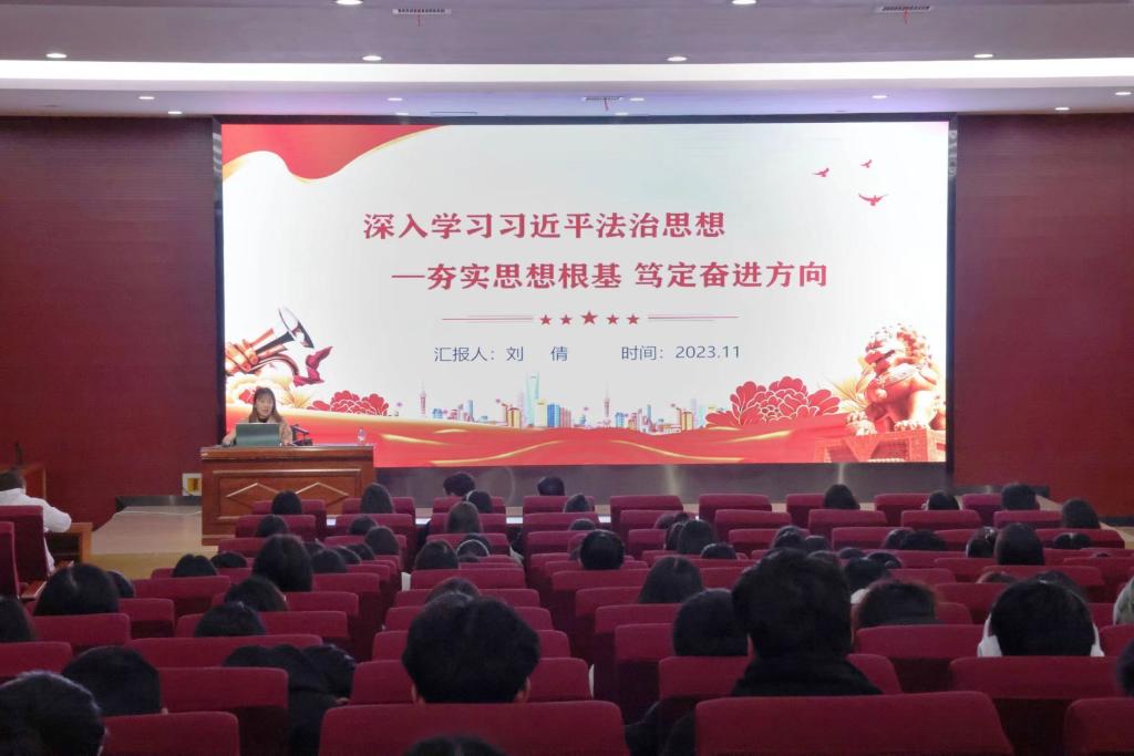 为深入学习贯彻习近平法治思想和总体国家安全观,持续推动法治主题教育走深走实,永利23411集团官网于11月15日在学院楼报告厅开展“双百”法治宣讲进校园活动。此次活动由文法学院党委副书记主持,刘倩老师进行主讲,校党委副书记张永福、宣传部负责人出席,文法学院教师代表及各学院学生代表参加。