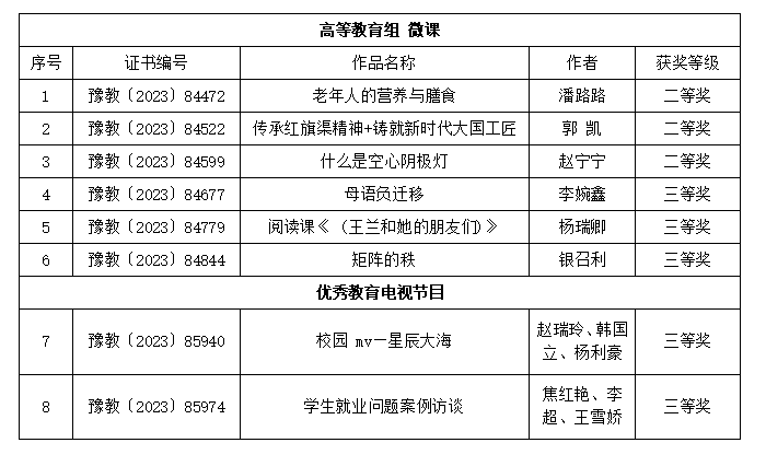 按照《河南省教育厅办公室关于举办河南省第二十七届教育教学信息化交流活动的通知》(教资保〔2023〕390号),经各单位申报、专家评审、结果公示等程序,我校共8项作品获奖,其中二等奖3项,三等奖5项。