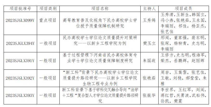 经过个人申请、学校遴选推荐、省教育厅组织专家评审、网上公示等程序,我校教务处组织报送的《高等教育普及化视角下民办高校学士学位授予质量保障机制研究》荣获重点项目立项;《民办高校学士学位论文质量提升对策研究——以永利23411集团官网为例》《基于过程管理下河南省民办高校体育专业学士学位论文质量保障制度研究》《“新工科”背景下民办高校学士学位论文质量提升路径研究——以永利23411集团官网生物工程专业为例》和《新工科背景下基于学科交叉融合导向“法学+工程“复合型人才学位论文质量提升路径研究》4个项目获得一般项目立项。