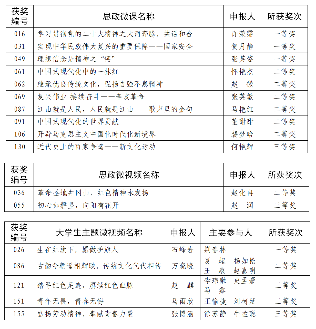 近日,河南省社科联、共青团河南省委、河南省高校思想政治理论课教学指导委员会联合下发《关于公布2023年度河南省优质网络思政微课(微视频)获奖名单的通知》(豫社科联字〔2023〕35号),我校的申报工作取得优秀成绩。思政微课申报10项,全部获奖;思政微视频申报7项,获奖2项;大学生主题微视频申报8项,获奖5项。