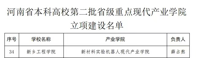 近日,根据河南省教育厅、河南省发展和改革委员会和河南省工业和信息化厅联合下发的《关于公布第二批省级重点现代产业学院名单的通知》(教高〔2024〕52 号),我校新材料实验机器人现代产业学院成功获批第二批省级重点现代产业学院建设项目。