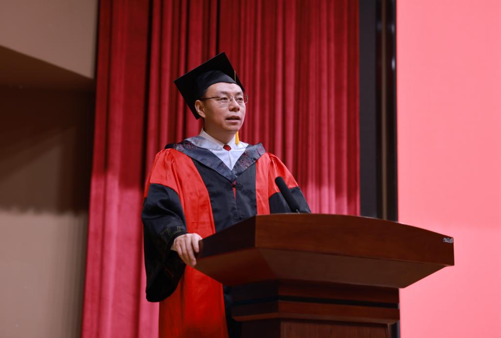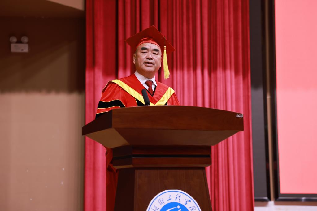 校学位评定委员会主席、校长张现周教授向圆满完成学业的毕业生们表示热烈的祝贺和美好的祝福,向辛勤养育、悉心指导毕业生的父母和老师致以衷心的感谢和崇高的敬意,他以“青春逢盛世,砥砺再扬帆”为题,为毕业生们讲授了在校最后一堂思政课,寄语同学们:一是要心系国家,勇担重任,笃定信仰之锚;二是要迎难而上,磨砺意志,高扬奋进之帆;三是要坚持学习,锤炼本领,力挥创新之楫;四是要修身立德,恪守正道,把稳人生之舵。