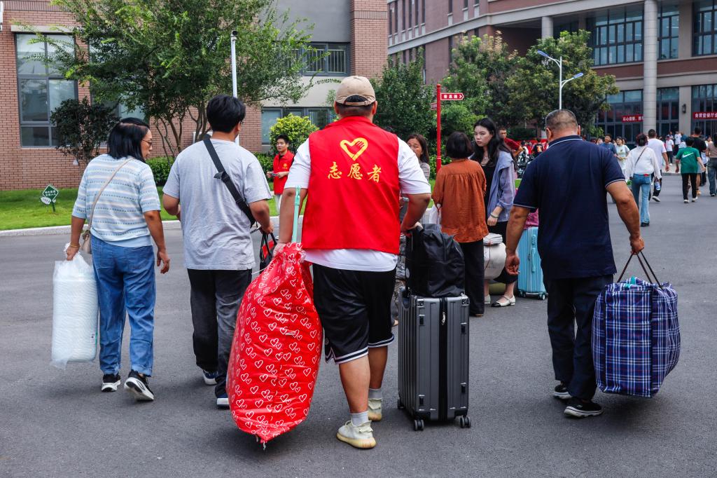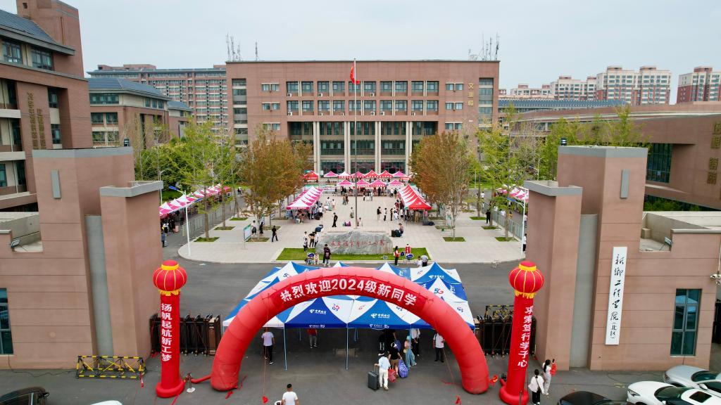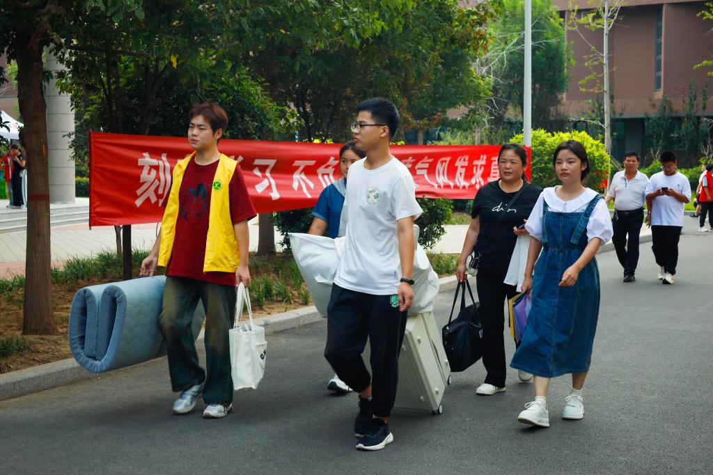 初秋的校园彩旗飘扬、喜庆热烈。火红的迎新拱门、热情洋溢的喷绘条幅、温暖贴心的指示标牌,仪式感满满的氛围布置,向踏入校门的“萌新”学子致以最热烈的欢迎,吸引着新生和家人朋友驻足合影留念。