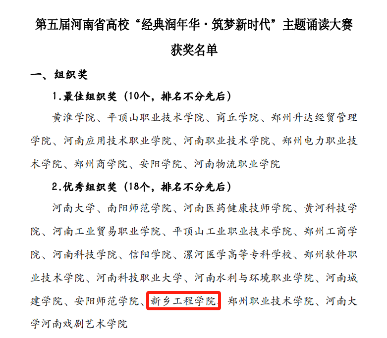近日,由河南省高校图书情报工作委员会和“学习强国”河南学习平台主办的第五届河南省高校“经典润年华·筑梦新时代”主题诵读大赛获奖名单公布。我校喜获优秀组织奖,4名学生荣获网络人气奖。