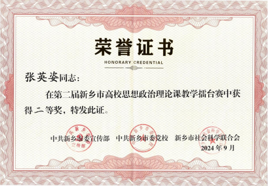 为加强在新高校思想政治理论课教学经验交流,促进在新高校思想政治理论课教师业务水平的提高,近期,中共新乡市委宣传部、市委党校、市社科联联合举办了第二届新乡市高校思想政治理论课教学擂台赛。经过各高校前期选拔推荐,共有来自十二所在新高校的参赛选手参加了比赛,我校马克思主义学院张英姿老师讲课成绩突出,荣获二等奖。