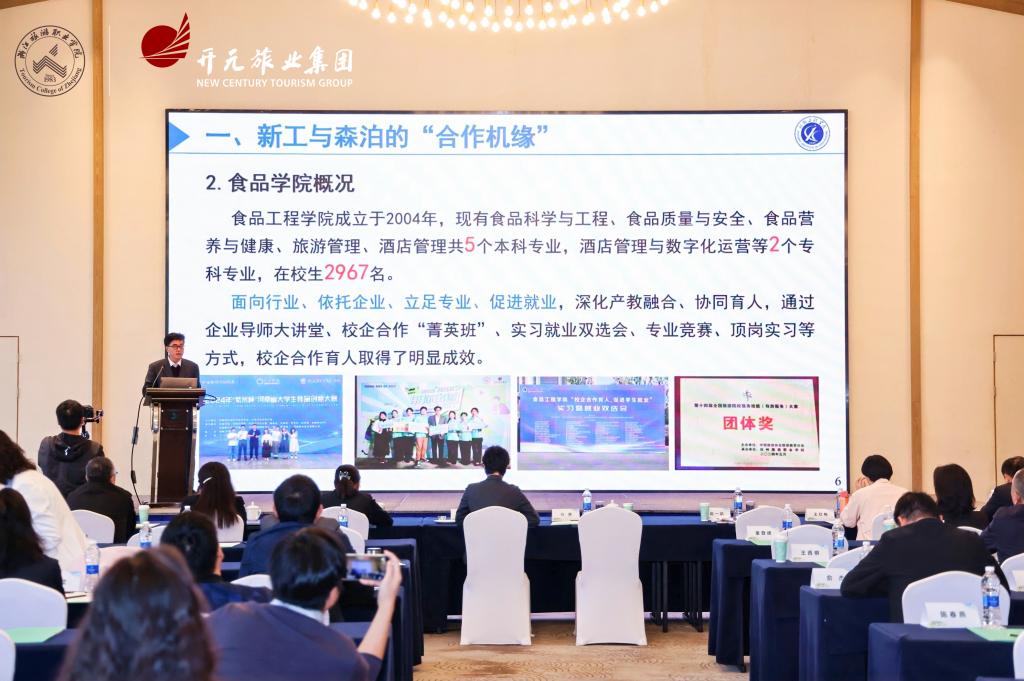 赵一鹏在致辞中介绍了学校与开元森泊集团通过共建平台、开展实训、协同就业等方式,实现资源共享、优势互补,运用“引进来”“走出去”“求实效”策略,对接行业需求,创新培养应用型复合型人才的协同育人新模式,并从“面向行业推进供给侧改革、顶岗实习实现就业零距离、健全机制深化合作求实效”等方面分享交流了学校在深化产教融合方面的实践和探索。