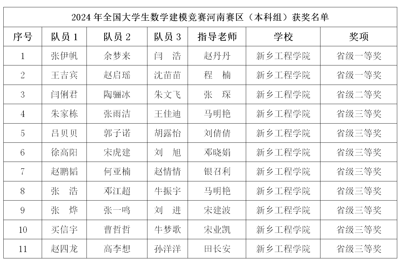近日,2024年(第十届)全国大学生数学建模大赛河南赛区比赛落下帷幕,获奖名单正式揭晓。河南省赛区共有40余所院校、1713支队伍报名参加。我校参赛队伍荣获省赛一等奖2项、二等奖1项、三等奖8项的好成绩,这是我校在全国大学生数学建模比赛中取得的新突破。