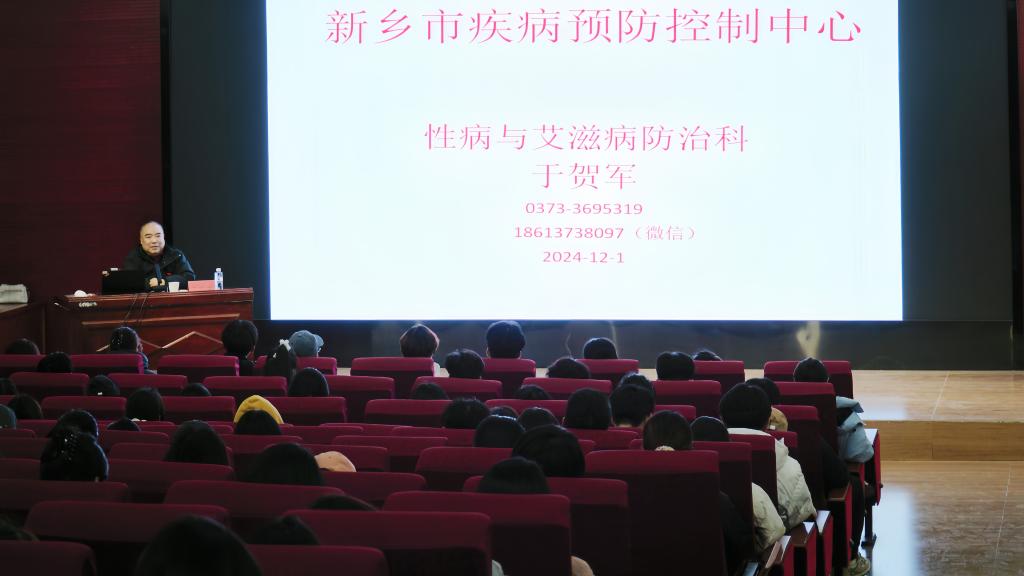 12月1日,新乡市疾控中心于贺军科长受邀来到我校,在学院楼报告厅为300余名学生代表作了一场关于艾滋病预防的专题讲座。校团委书记主持讲座。