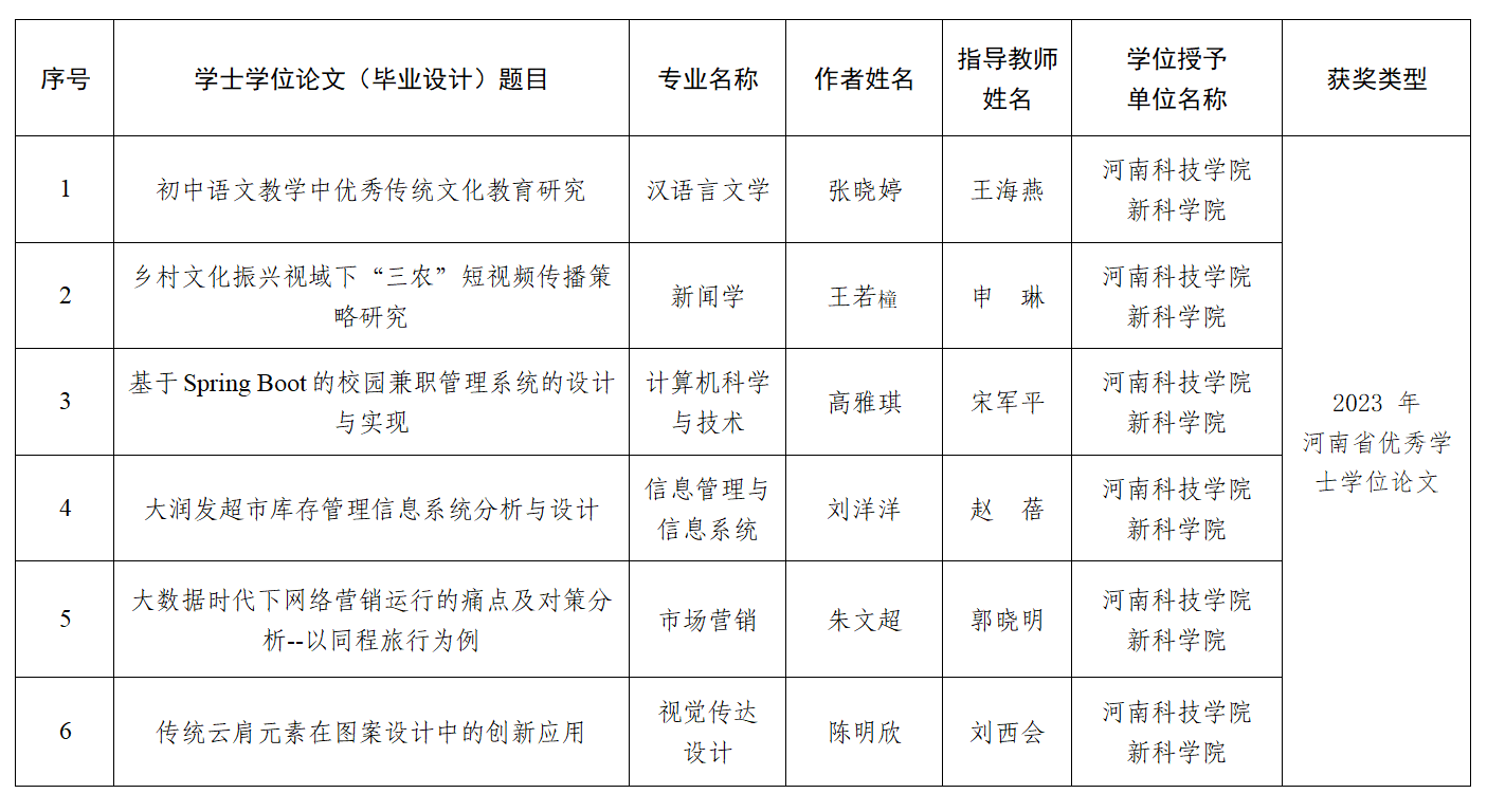 近日,河南省教育厅下发《关于公布2023年河南省优秀学位论文评选结果的通知》(教研〔2024〕369号),我校《初中语文教学中优秀传统文化教育研究》等6篇学位论文获评2023年河南省优秀学士学位论文。