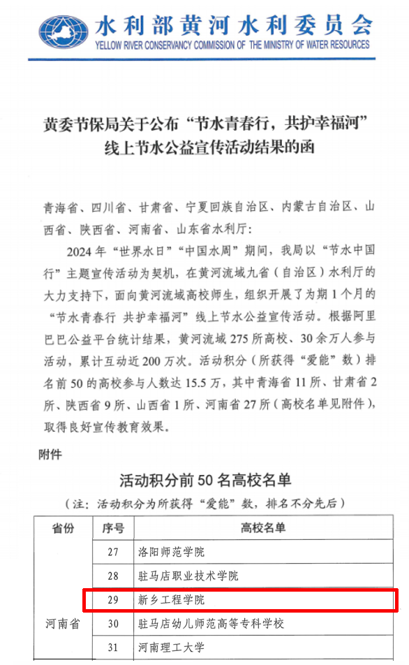 近日,水利部黄河水利委员会发布《关于公布“节水青春行 共护幸福河”线上节水公益宣传活动结果的函》,表扬九省共50所高校。我校组织师生积极参与节水宣传,取得活动积分前50名的佳绩,是河南上榜的27所高校之一。