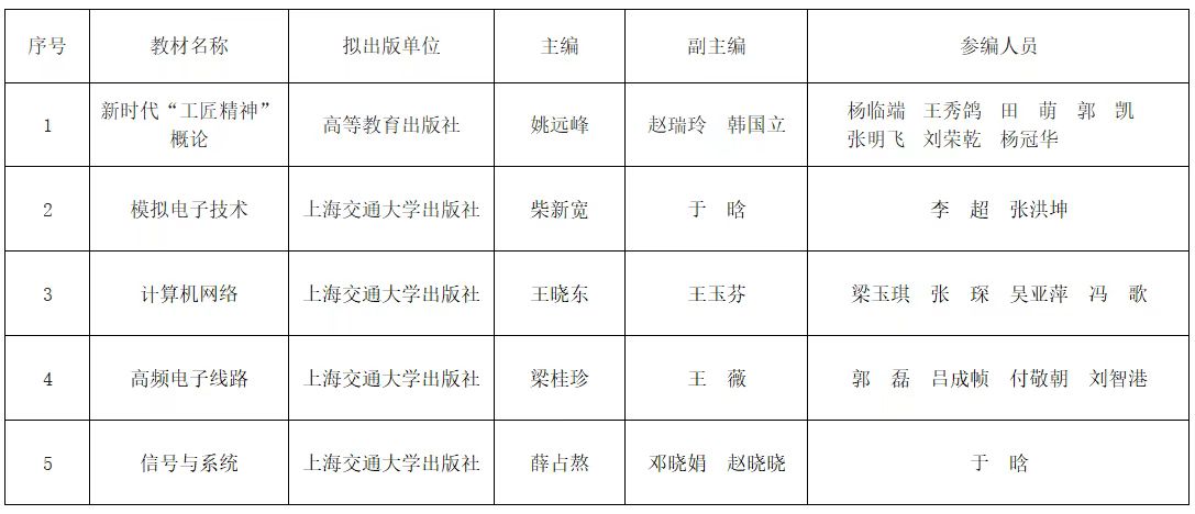 经学校申报、会议评审、网上公示等程序,我校组织报送的《新时代“工匠精神”概论》获批河南省第二批普通高等教育“十四五”规划教材(高等教育出版社系列教材)项目立项建设;《模拟电子技术》《计算机网络》《高频电子线路》《信号与系统》获批河南省第二批普通高等教育“十四五”规划教材(重点关键领域系列核心教材)项目立项建设。