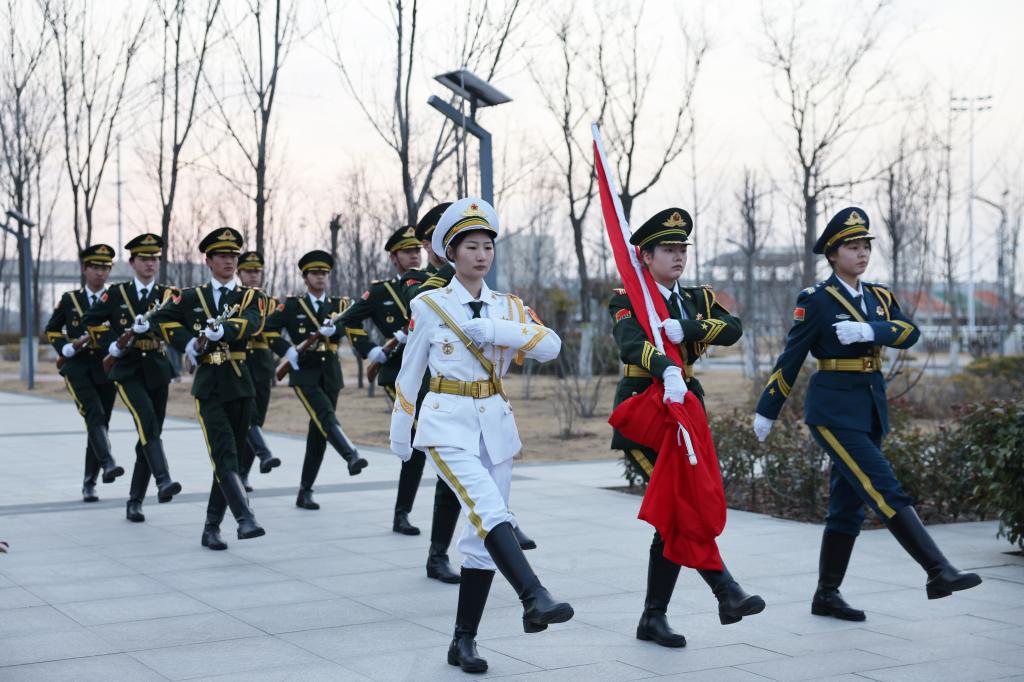 迎着清晨的阳光,国旗护卫队迈着整齐的步伐,护送国旗走向升旗台。伴随着激昂的国歌声,五星红旗冉冉升起,全体师生神情庄重,目视国旗,共同开启新学期的征程。