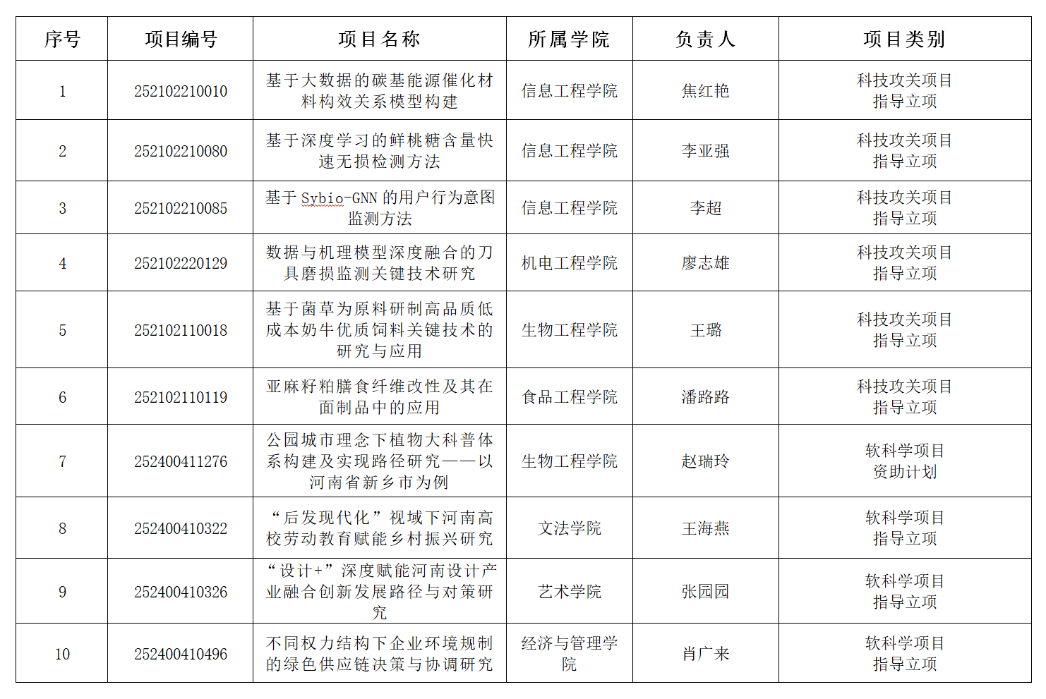 近日,河南省科学技术厅发布《关于下达河南省二O二五年科技发展计划的通知》(豫科〔2025〕23号),我校成功获批10项河南省科技发展计划项目,其中,河南省科技攻关项目6项,河南省软科学研究项目4项。