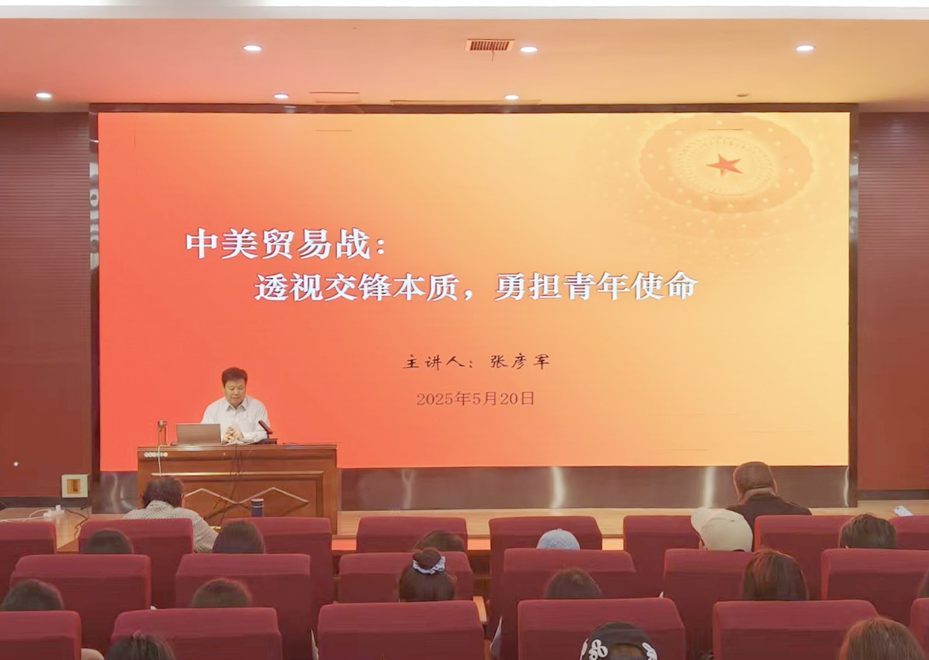 张彦军结合当下时代背景,从中美贸易战的爆发与发展、贸易战的本质与美国的战略意图、中国的应对策略与底气、贸易战对中国经济和社会的影响、青年在贸易战背景下的责任与担当等五方面进行了深入阐述。讲授中,他旁征博引,通过大量生动鲜活的案例,从爱国主义情怀培养、理想信念树立、社会责任感提升等多个维度进行深入剖析,引导同学们用辩证的思维看待问题、明辨是非,增强政治敏锐性和鉴别力,争做有理想、敢担当、能吃苦、肯奋斗的新时代好青年。