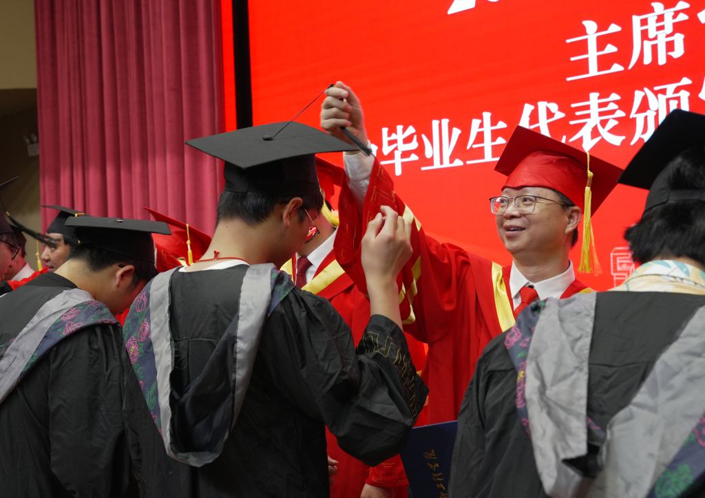 校党委副书记张永福宣读了关于表彰学习标兵、优秀毕业生的决定,并通报2025年春季应征入伍毕业生情况;副校长赵瑞玲宣读了关于授予学士学位的决定。在欢快的音乐声中,校领导为学习标兵和优秀毕业生代表颁奖,并为毕业生们颁授证书、拨苏正冠。