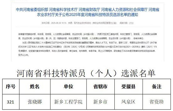 近日,河南省科学技术厅公布了2025年度河南省科技特派员选派名单,我校食品工程学院张晓娜副教授入选名单,并获得省财政资金支持,将被派驻新乡市豫贺食品发展有限公司,协助企业开展系列酱卤肉制品新产品开发、新配方新工艺优化、产品安全与品质控制以及员工技术培训等工作。