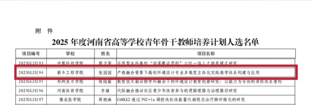 近日,河南省教育厅发布《关于公布2025年度河南省高等学校青年骨干教师培养计划人选名单的通知》(教办高〔2025〕217号)。经学校申报、审阅材料、专家评议、结果公示,我校张园园被列为青年骨干教师培养计划培养对象。