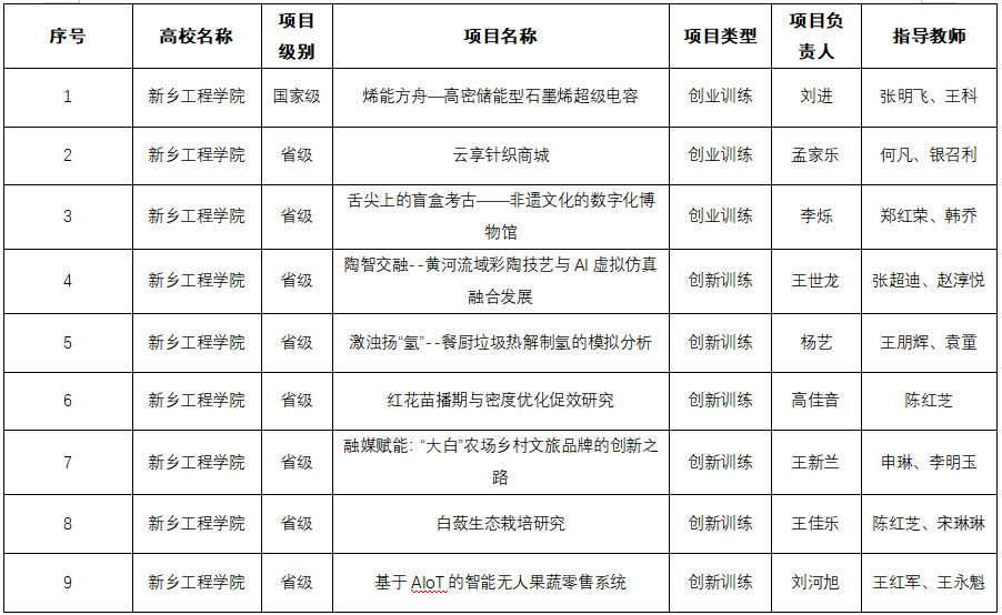 近日,河南省教育厅办公室公布了2025年大学生创新创业训练计划立项项目的评选结果,我校9个项目获批立项。其中,国家级创业训练项目1项、省级创业训练项目2项,省级创新训练项目6项。