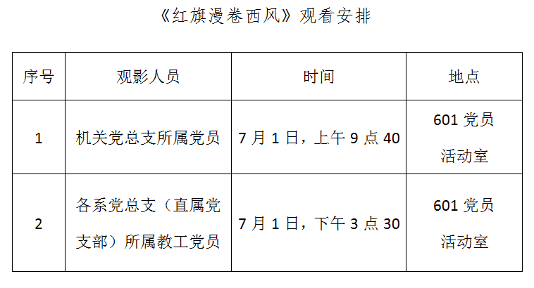 为庆祝中华人民共和国成立70周年,进一步学习贯彻习近平新时代中国特色社会主义思想和党的十九大精神,贯彻落实习近平总书记关于“用党的历史教育党员、教育干部、教育群众尤其是教育青少年”的重要指示,近期将组织观看党史优秀纪录影片《红旗漫卷西风》。
