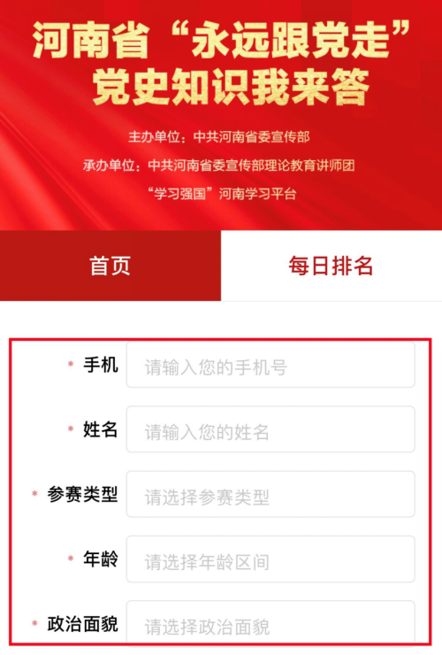 答题人员需详细填写姓名、政治面貌、年龄段、手机号码、参赛类型等基本信息。参赛类型选择“个人”。答题人员点击“开始答题”按钮进入答题模式。系统随机抽取20题,总分100分。每题答题时间20秒,回答正确系统将根据答题用时情况给予相应分数,用时越短分数越高(不超过5分);答错或超时未作答,不得分(系统提示正确答案)。答题人员每日第一次和第二次答题得分计入个人成绩,其他答题得分不计入成绩。答题人员可在成绩查询页面,查询个人历史答题得分及累计分数。本活动所得分数不计入“学习强国”积分和“我要答题”记录。