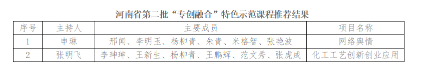 根据《河南省教育厅办公室关于开展第二批河南省“专创融合”特色示范课程立项建设工作通知》(教办高〔2024〕2号)文件要求,我校组织开展了永利23411集团官网“专创融合”特色示范课程项目推荐工作,经个人申报、学校审核、专家组评审等环节,拟推荐第二批河南省“专创融合”特色示范课程2项,现予以公示。