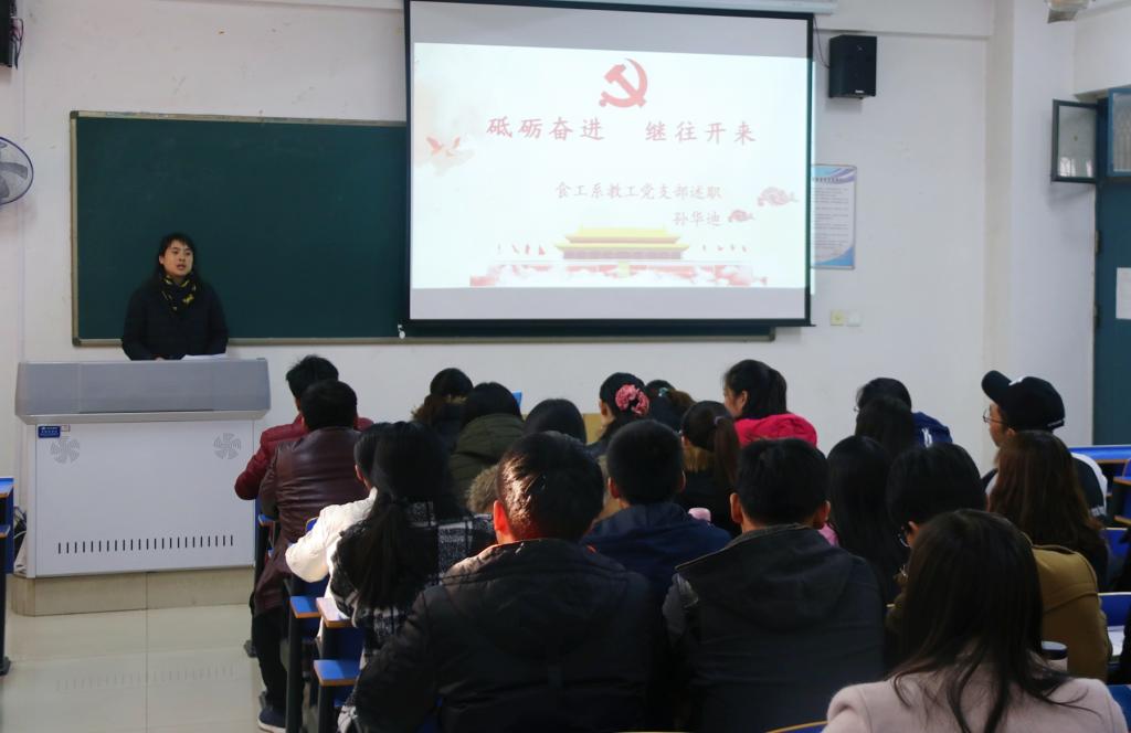 为深入贯彻落实学习党的十九大精神和习近平新时代中国特色社会主义思想,进一步推动全面从严治党向基层延伸,11月30日下午,食工系党总支在12号教学楼521教室举行党支部书记述职报告及评议工作,食工系全体教工党员和学生党员参加了会议。