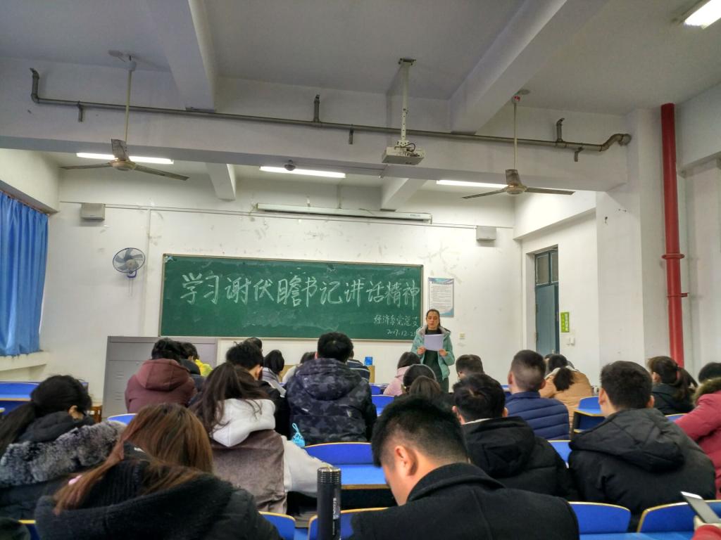 12月20日,经济系全体师生在系党总支书记田萌的带领下认真学习谢伏瞻书记在河南师范大学宣讲党的十九大精神专题党课报告精神。